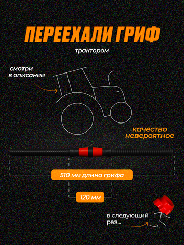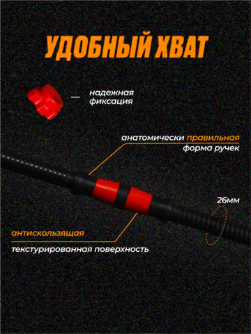 Удобный гриф со специальными насечками, предотвращающими скольжение в руке! Внутри грифа - стальная труба, толщиной 2мм, что делает его легким, но в то же время очень прочным!