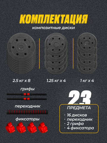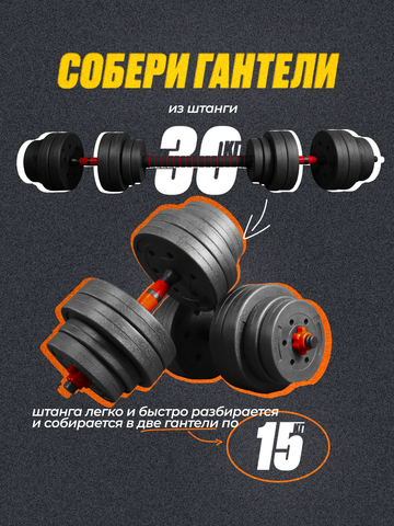 За указанную цену Вы получаете как штангу 30кг, так и 2 гантели по 15кг!