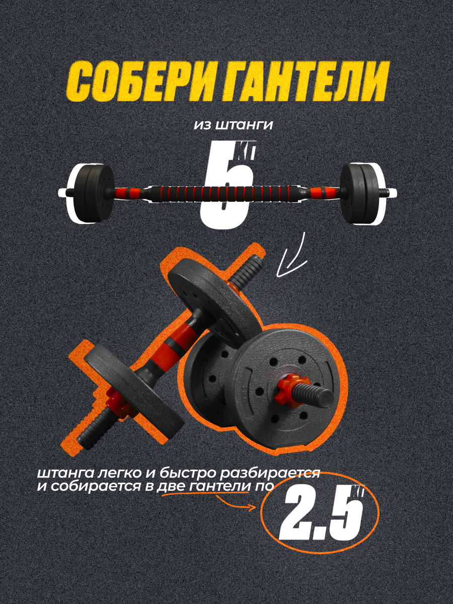 За указанную цену Вы получаете как штангу 5кг, так и 2 гантели по 2,5кг!