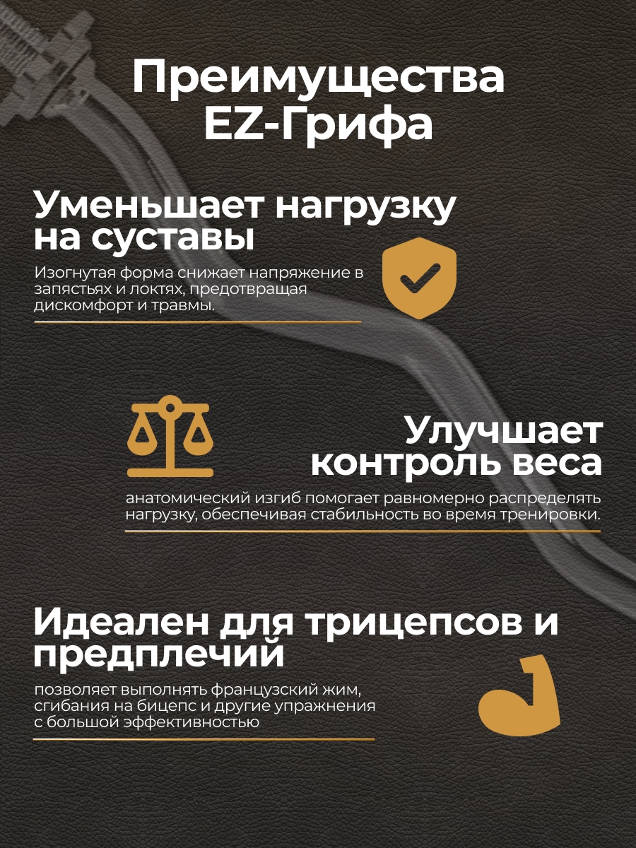 2) Гриф EZ-образный - удобен для таких упражнений как: подъем штанги на бицепс, французский жим лежа.
